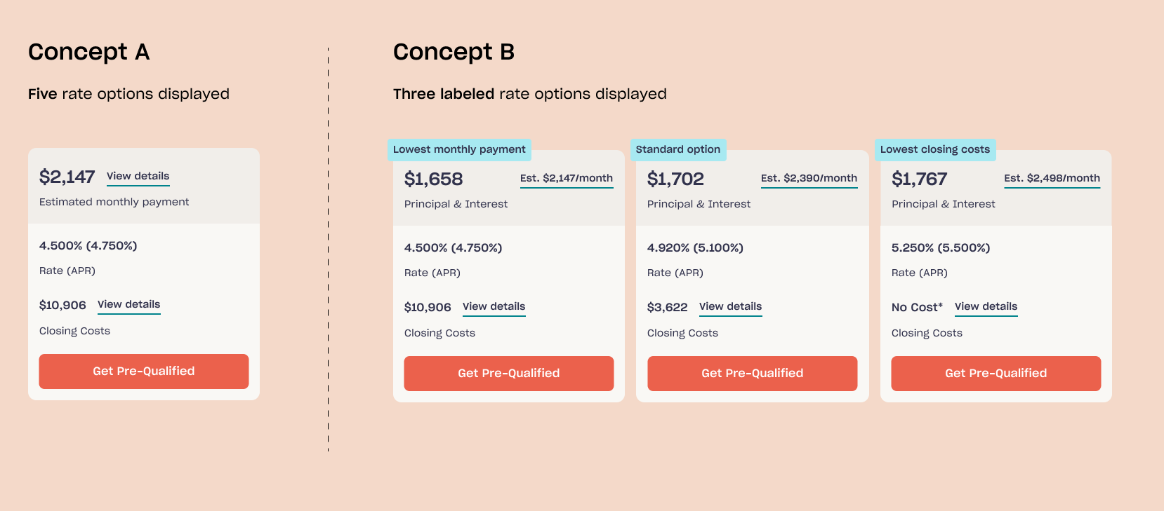 - Test out different CTA language for the primary button on each rate card. "Get pre-qualified", "Get started", "Learn more".