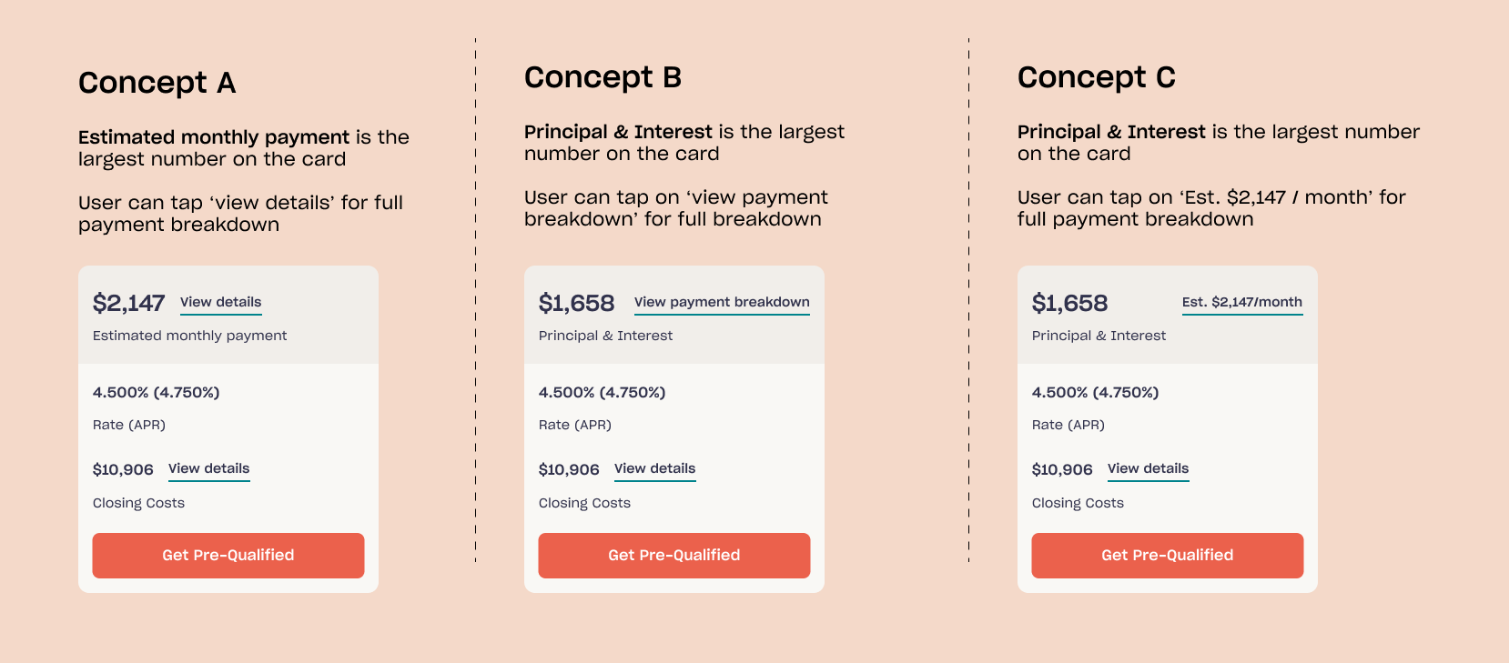 Test plan - A/B/C test the original design against two new designs. Do users understand the difference between the estimated monthly payment and the P&I?